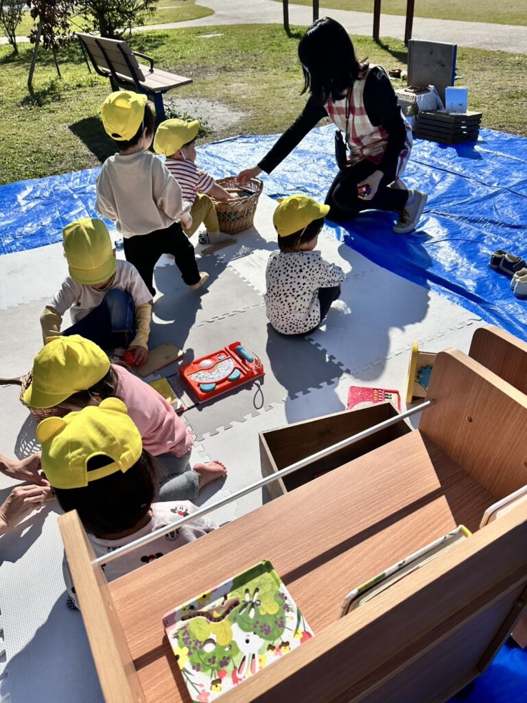 でんしゃ公園で絵本ひろばを開いていただき、みんなで遊びました!